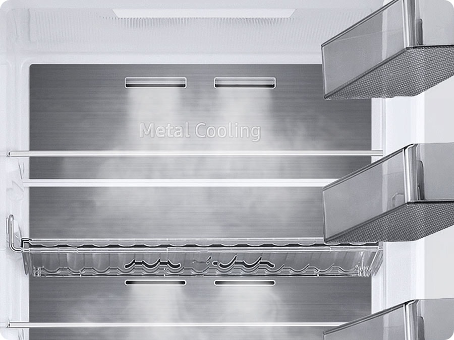 Technologia Metal Cooling to doskonała izolacja i niezwykła funkcjonalność chłodzenia. Specjalny panel tylnej ścianki urządzenia kumuluje niską temperaturę, dzięki czemu doskonale zatrzymuje zimno we wnętrzu lodówki nawet przy jej częstym otwieraniu. Zapewnia oszczędność czasu chłodzenia i energii.
