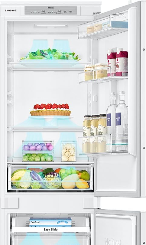 Technologia No Frost poprawia cyrkulację powietrza, tak aby zapewnić utrzymanie jednakowej temperatury w każdym rogu chłodziarki, co zapobiega powstawaniu szronu i lodu. Technologia ta pozwala również na dużo szybsze osiągnięcie temperatury docelowej, zwiększa trwałość systemu chłodzącego i eliminuje marnowanie energii elektrycznej na cykliczne, manualne odmrażanie urządzenia.