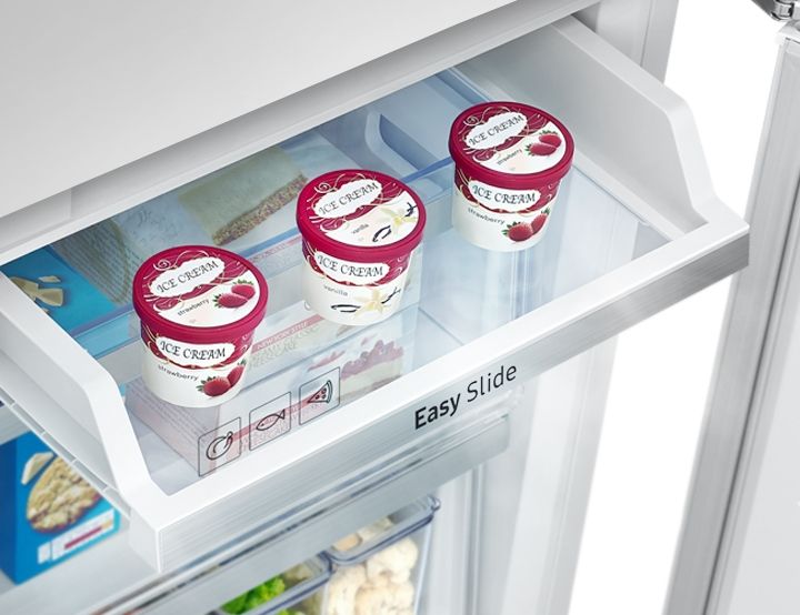 Sięganie do zamrażarki często oznacza przebijanie się przez istny tor przeszkód złożony z różnych produktów, ale półka Easy Slide po prostu wysuwa się i wsuwa z powrotem. Dzięki temu można efektywnie przechowywać, układać i wyjmować zamrożone produkty – szybko i łatwo odnajdując i wyciągając te, które umieszczone zostały z tyłu i w rogach.