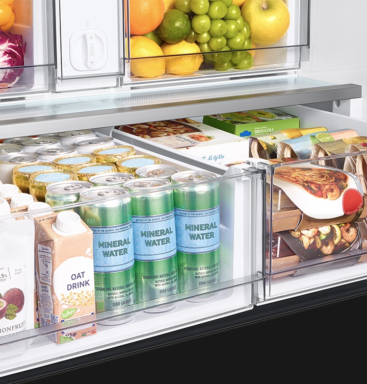 Zadbaj o delikatną żywność. Nowa wielka spiżarnia to oddzielna szuflada, która umożliwia przechowywanie znacznie większej ilości mięsa, drobiu i ryb, w tym produktów o dużych rozmiarach. Możesz również przechowywać różne rodzaje pakowanych produktów, takich jak wstępnie przygotowana żywność czy zestawy posiłków. Nawet puszki z napojami można przechowywać w pozycji pionowej.