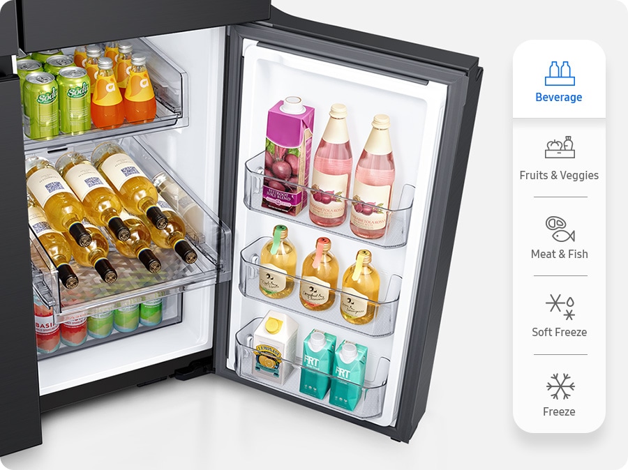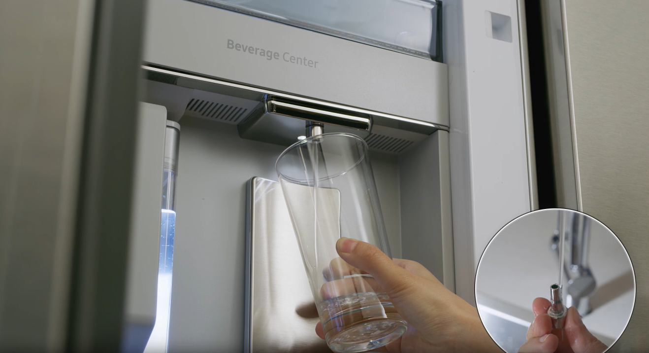 Wbudowane Beverage Center™ to strefa szybkiego i łatwego dostępu do orzeźwiającej, filtrowanej wody. Znajduje się ono wewnątrz lodówki, dzięki czemu jest mniej narażone na zanieczyszczenia i ma estetyczny, czysty wygląd. W jego skład wchodzi dzbanek Autofill Pitcher, który automatycznie napełnia się oczyszczoną wodą, a Ty możesz wzbogacić ją owocami lub ziołami, oraz dystrybutor wody ze stali nierdzewnej, który pozwala szybko nalać sobie szklankę chłodnego napoju. Całe centrum zostało zaprojektowane z myślą o maksymalnej wygodzie i higienie.
