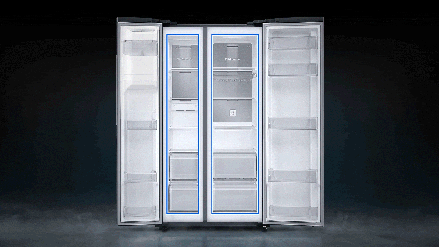 System All-around Cooling sprawia, że chłodne powietrze dociera do każdego zakamarka lodówki. Jest wdmuchiwane przez liczne otwory znajdujące się na poziomie każdej półki, dzięki czemu w lodówce panuje stała temperatura, a żywność pozostaje świeża.