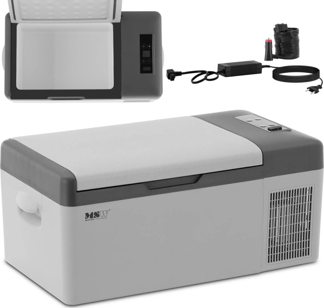 Lodówka/zamrażarka samochodowa marki MSW najlepiej sprawdzi się w podróży w samochodzie osobowym, ciężarowym, łodzi lub przyczepie kempingowej. Złącze 12/24 V (DC) / 100 - 240 V (AC) utrzymuje stałą temperaturę. Lodówkę można zasilać również poprzez odpowiedni akumulator lub moduł solarny. Kompaktowe rozmiary obudowy (57 x 32 x 25 cm) wykonanej z polietylenu o dużej gęstości (HDPE). Zakres temperatur wynosi od -20°C do +20°C, jest wydajna i niezawodna dzięki mocy wyjściowej 60 W i solidnej uszczelce. Cyfrowy panel umożliwia ustawienie żądanej temperatury i wybór pomiędzy dwoma poziomami mocy Max lub ECO w komorze 15 l.