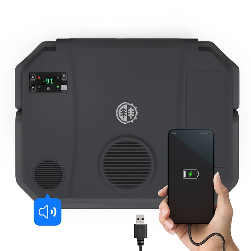 Wbudowany port USB pozwala wygodnie ładować smartfon lub inne urządzenia mobilne podczas korzystania z lodówki – to praktyczne rozwiązanie na biwaku czy w trasie. Tryb ECO* wspiera oszczędne zużycie energii podczas pracy z akumulatora samochodowego.