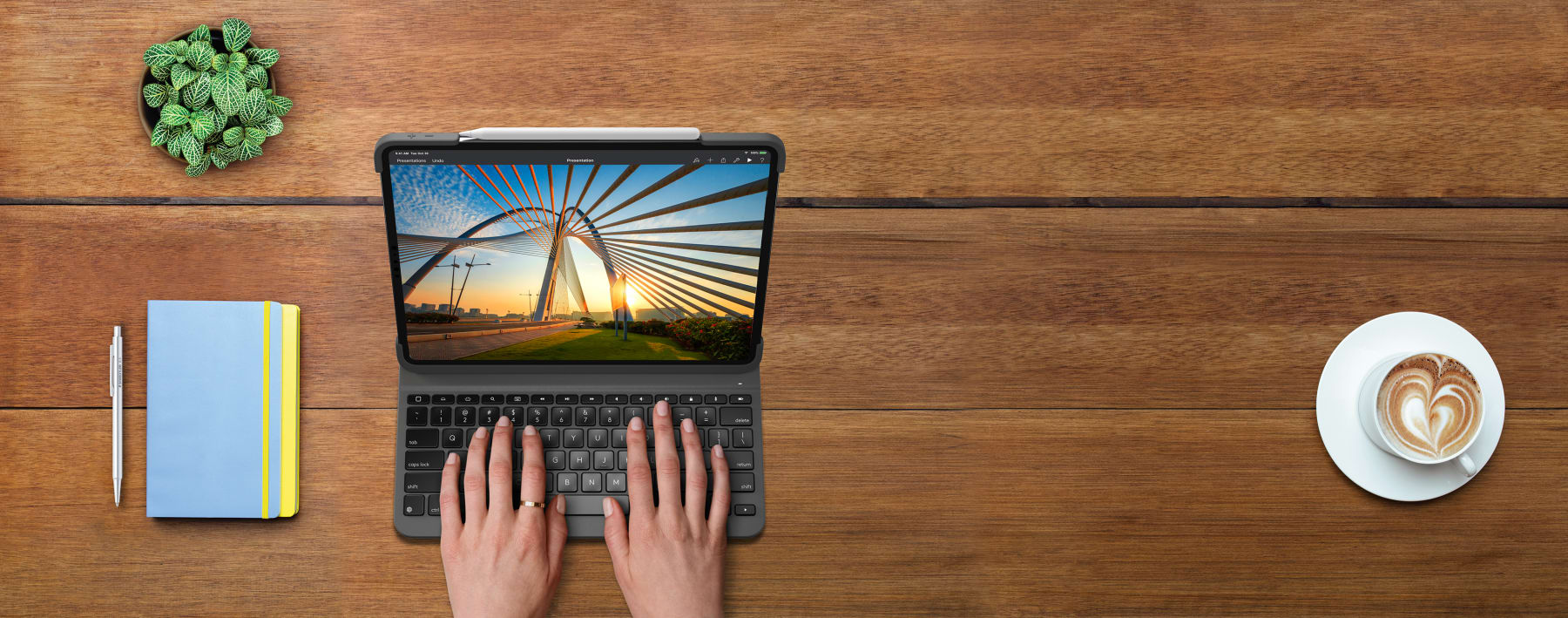 Ciesz się wygodą pisania na iPadzie Pro tak, jak na laptopie, dzięki etui Slim Folio Pro. Trzy tryby używania umożliwiają najbardziej wydajną pracę, niezależnie od miejsca — przy stoliku w kawiarni, na biurku lub na kolanach. To lekkie etui typu „wszystko w jednym” zapewnia ochronę urządzenia od przodu i tyłu, a ponadto jest wyposażone w przydatne miejsce na rysik Apple Pencil (2. generacji) z możliwością ładowania.