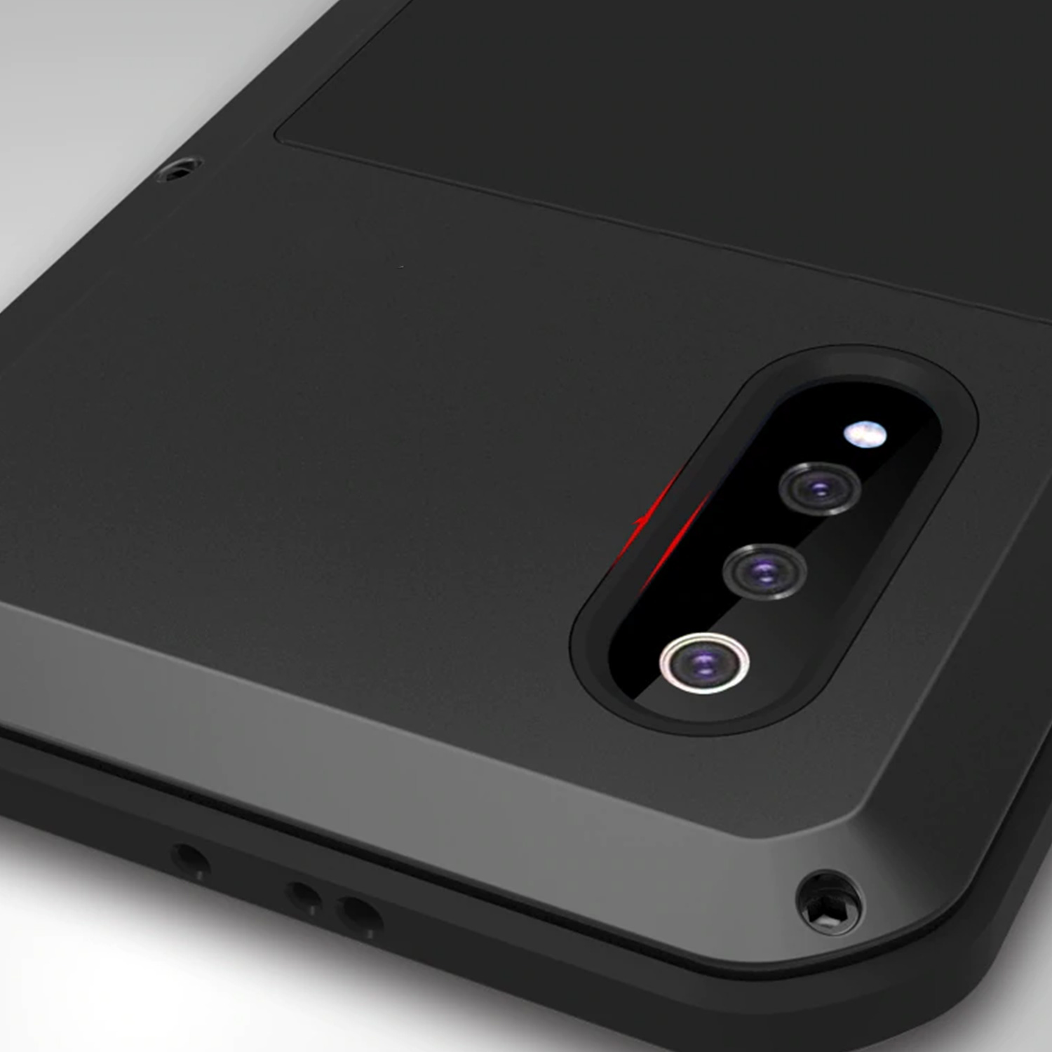 Produkt działa na zasadzie dwustronnej ochrony - do wnętrzna produktu wkłada sie urządzenie, następnie za pomocą śrub zamontowanych w krawędziach etui, smartfon jest szczelnie zamykany - revers chroniony jest przez mocne aluminium a front przez ultra wytrzymałe szkło przewodzące dotyk.