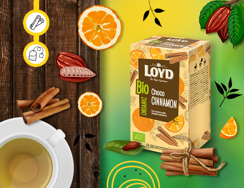 Prażone ziarno kakaowca i skórkę pomarańczy okrasiliśmy pikantnym imbirem i aromatycznym cynamonem. Brzmi kusząco? Tak wyrafinowaną kompozycję odkryjesz tylko w herbatce owocowo-ziołowej LOYD Bio Organic Choco Cinnamon. Spraw sobie odrobinę przyjemności i spróbuj smaku tego wspaniałego naparu.