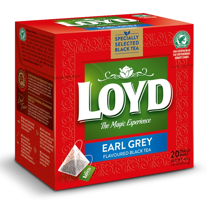 LOYD Earl Grey należy do linii czarnych herbat liściastych, pełnej wysublimowanych smaków. Ten rodzaj herbaty czarnej swoją nazwę zawdzięcza hrabiemu Charlesowi Greyowi, który zasłynął z rozpropagowania jej receptury. Napar z suszu czarnej herbaty nabywa specyficznego, wyjątkowego aromatu dzięki olejkowi ze skórki bergamotowej pomarańczy. Delikatne płatki bławatka niezwykle uszlachetniają bukiet tej znakomitej mieszanki.Ta propozycja należy do linii wysublimowanych czarnych herbat liściastych, porcjowanych w piramidki, które dzięki zastosowaniu innowacyjnego, jedwabistego, idealnie neutralnego smakowo materiału, jeszcze lepiej uwalniają zawarty w mieszance bukiet i smak. Trójwymiarowy kształt torebki zapewnia listkom herbaty wystarczająco dużo miejsca, aby w pełni mogły się rozwinąć i oddać pełnię aromatu bezpośrednio do wrzątku, tworząc napar najwyższej jakości - jak z zaparzacza.LOYD Earl Grey pomoże Ci odkryć magię we wszystkim, co Cię otacza. Daj się oczarować, bo LOYD to herbata z nutą magii. Zestaw zawiera 4 opakowania herbaty Loyd Earl Grey