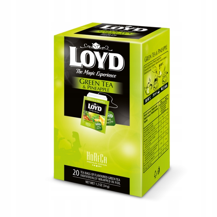 Linia LOYD HoReCa to oferta herbat wysokiej jakości przeznaczone dla gastronomii.Specjalnie wyselekcjonowane herbaty oraz smaki gwarantują zadowolenie Klienta. Każda torebka tej wyjątkowej herbaty zapakowana jest w osobną kopertę z metalizowanej folii o wysokiej barierowości, co bezpośrednio przekłada się na utrzymanie świeżości produktu. Zestaw zawiera 4 opakowania herbaty zielonej z ananasem Loyd po 20 torebek.