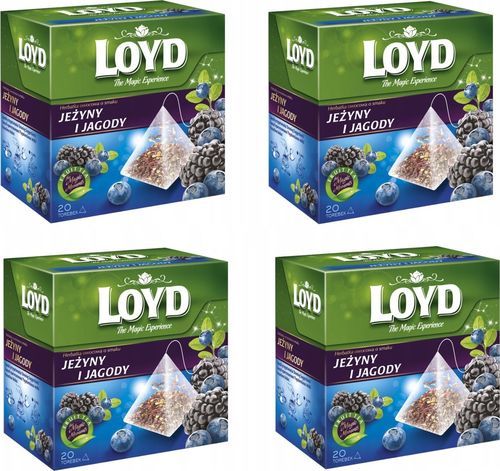 Produkowana z najwyższej jakości składników owocowa herbatka o smaku jeżyny i jagody to propozycja, która wskaże nowe horyzonty smaku, zachwyci głębokim i intensywnym kolorem naparu oraz urzeknie smakiem dojrzałych leśnych owoców.Słodycz jagody i przyjemna kwaskowatość jeżyny zostały zamknięte w trójwymiarowych piramidkach, które dzięki zastosowaniu innowacyjnego, jedwabistego materiału, jeszcze lepiej uwalniają zawarty w owocowym suszu bukiet i smak. Idealnie neutralne smakowo, w pełni biodegradowalne torebki znakomicie eksponują surowiec, dzięki czemu napar w Twojej filiżance nie tylko zadziwi niepowtarzalnym smakiem, ale także pomoże zaczarować każdą chwilę, tak by pomóc Ci odkryć magię we wszystkim, co Cię otacza.Przekonaj się, jak herbatka LOYD o smaku jeżyny i jagody zaserwowana na gorąco wspaniale rozgrzewa, a podana w formie mrożonej zapewnia przyjemne orzeźwienie w upalne dni. Pozwól się oczarować, bo LOYD to herbata z nutą magii. Zestaw zawiera 4 opakowania herbat Loyd Jeżyny i Jagody