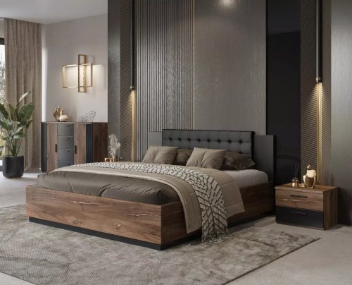 Łóżko dostępne jest w eleganckim kolorze dąb flagstaff z miedzianą nitką oraz czarnym matowym wykończeniem. Taka kolorystyka sprawia, że mebel doskonale komponuje się z różnorodnymi stylami aranżacji wnętrz, dodając im charakteru i przytulności.