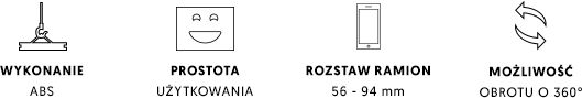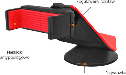 Uchwyt został zaprojektowany tak, aby pasował do większości smartfonów dostępnych na rynku. Wszystko to dzięki zastosowaniu ruchomych łopatek trzymających urządzenie w uchwycie. Element trzymający, zamocowany został na obrotowej główce, co umożliwia swobodny obrót urządzenia, znajdującego się w uchwycie, o 360 stopni. Przyssawka wykonana z silikonu gwarantuje pewne trzymanie na szybie pojazdu.