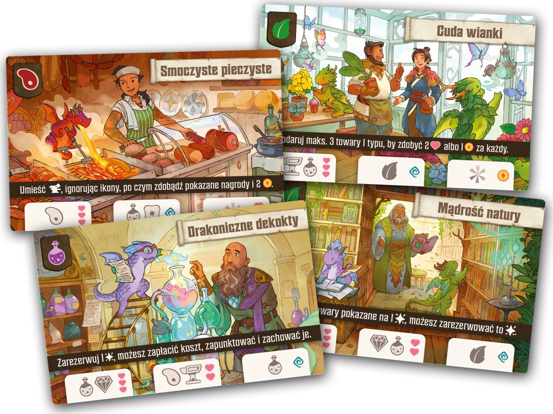Zawartość: 210 żetonów towarów, 42 karty sklepów, 42 karty smoków, rzemieślników, 36 kart frymuśnych smoków, 36 kart zaklęć, 24 żetony monet, 8 kart pomocy, 7 kart towarzyszy, 6 znaczników reputacji, 6 pionków gracza, mata miasteczka, instrukcja.