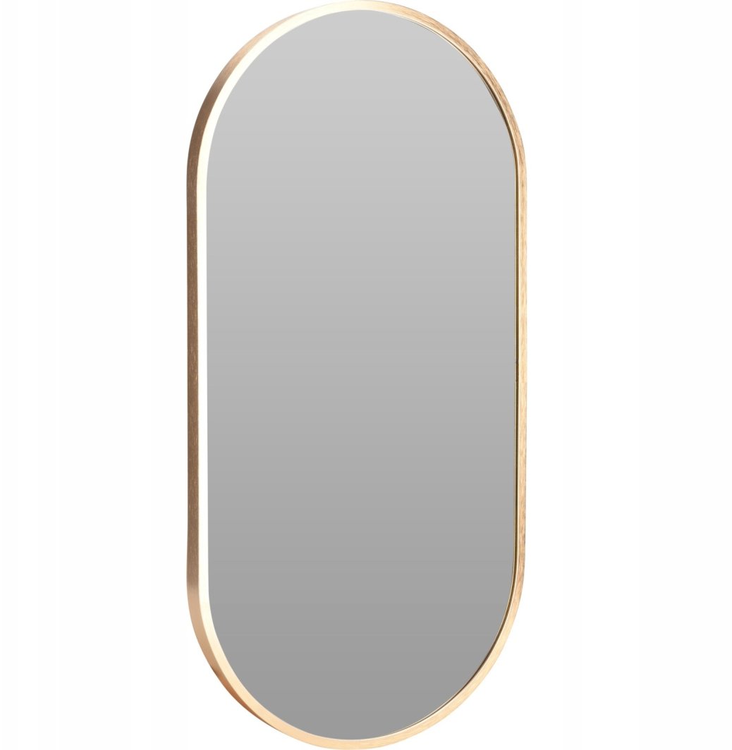 Lustro wiszące o owalnym kształcie, mierzące 30x60 cm, z elegancką złotą ramą, to znakomity dodatek do każdego wnętrza. Dzięki nowoczesnemu designowi oraz smukłej, aluminiowej konstrukcji, lustro nie tylko spełnia funkcję praktyczną, ale również stanowi stylowy akcent, który wzbogaca aranżację pomieszczeń.