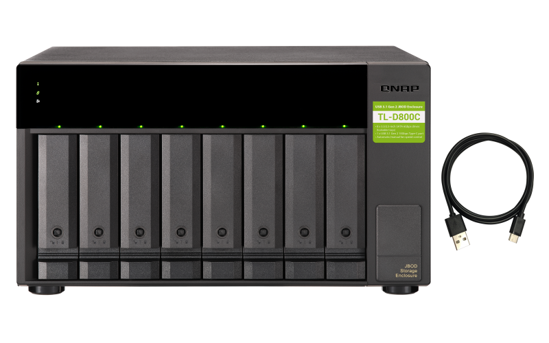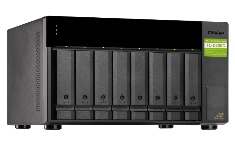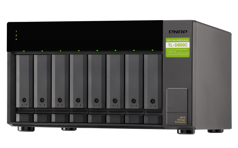 Obudowa JBOD TL-D800C umożliwia tworzenie kopii zapasowych i rozbudowę systemu QNAP NAS. Model TL-D800C oferuje osiem 3,5-calowych wnęk na dyski SATA 6 Gb/s z łącznością USB 3.2 Gen2 (10 Gb/s) Type-C, zapewniając możliwość szybkiej i płynnej rozbudowy.
