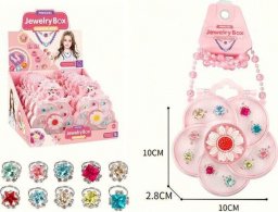 W zestawie znajdują się pierścionki w czterech różnych kształtach: kwiatek, gwiazdka, kwadratowy diamencik oraz okrągły diamencik. Taka różnorodność sprawia, że każde dziecko znajdzie coś dla siebie, a zabawa z pierścionkami stanie się jeszcze bardziej interesująca.