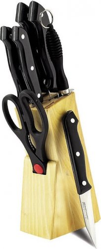 Zestaw noży w bloku Maestro MR-1402 8-elementowy Zestaw noży z ostrzałką wykonany ze stali nierdzewnej z wygodnymi uchwytami. NAJWAŻNIEJSZE PARAMETRY Komplet: 8 elementów Skład zestawu: blok na noże, nóż szefa kuchni, nóża trybowania, nóża ogólnego przeznaczenia, noża do obierania, nożyc kuchennych, noża do chleba, ostrzałki 7,5” Wygodne uchwyty Profesjonalne ostrzenie Design ergonomiczny Stal nierdzewna wysokiej jakości