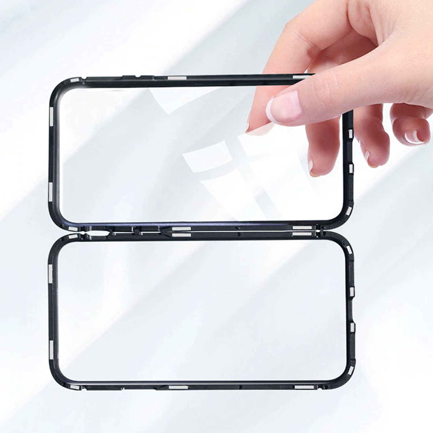 Produkt składa się z dwóch części. Pierwszą z nich jest tylna część, która składa się z kolorowej ramki, na której krawędziach zamontowane zostały magnesy, oraz przezroczystego szkła.