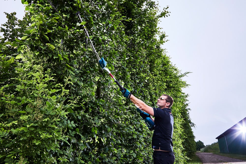 Model DUN500W został zaprojektowany z myślą o maksymalnej kontroli i komforcie. Głowicę tnącą można regulować w 6 stopniach w łącznym zakresie 115° (od 45° w górę do -70° w dół), co umożliwia precyzyjne cięcie wierzchołków i boków żywopłotów pod różnymi kątami. Dodatkowo, urządzenie oferuje 3-stopniową elektroniczną regulację częstotliwości skoków, pozwalając dostosować prędkość do gęstości gałęzi. Wąska obudowa i doskonałe wyważenie ułatwiają manewrowanie narzędziem.