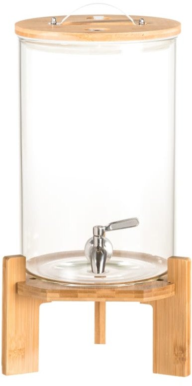 Dozator wyróżnia się nowoczesnym stylem, który łączy przezroczyste szkło borokrzemowe z naturalnymi akcentami bambusa oraz stalą nierdzewną. Taki dobór materiałów nie tylko zapewnia estetyczny wygląd, ale także trwałość oraz odporność na wysokie temperatury.