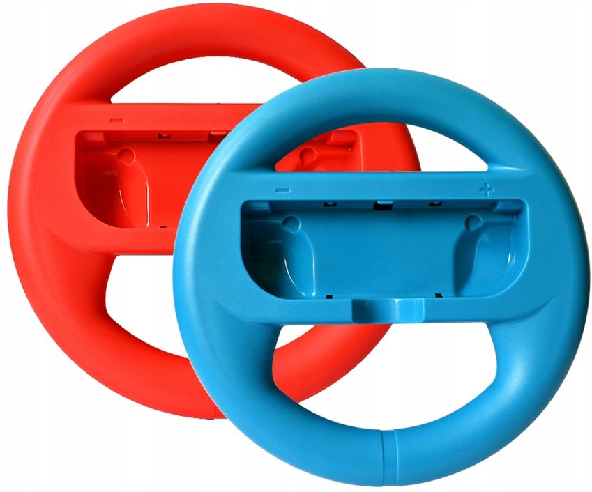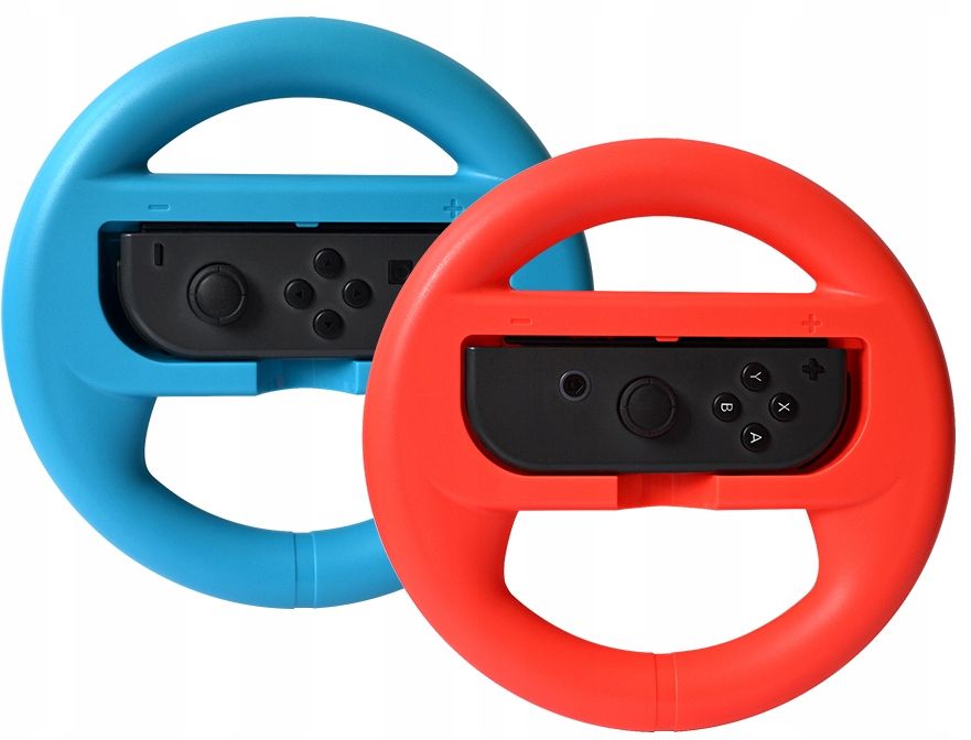 Zestaw dwóch uchwytów w kształcie kierownicy na kontrolery Joy-Con od konsoli Nintendo Switch. Uchwyty idealnie sprawdzają się w grach samochodowych, zapewniając dużo lepszą wygodę i przyjemność użytkowania niż przy zabawie z wykorzystaniem wyłącznie samych kontrolerów.