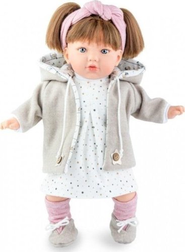 Śliczne rysy buźki podkreśla ubiór. Lalka ma na sobie białą sukieneczkę w kolorowe kropki. Ubranko wyposażono w zapięcie na rzep. Zimową stylizację uzupełnia beżowa kurteczka z kapturem w której środek jest wysłany białym materiałem ozdobionym drobnym wzorem. Okrycie wierzchnie wykorzystasz podczas spacerów z lalą w chłodniejsze dni. Ponadto Alina na nóżkach ma założone dłuższe, różowe skarpetki oraz beżowe materiałowe buciki. Cały komplet wyśmienicie komponuje się z resztą stroju. Wszystkie ubranka można zdjąć i przebierać lalę.