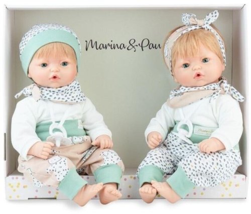 Modnie ubrana para 40-centymetrowych bliźniaków to jedyna w swoim rodzaju propozycja od producenta lalek hiszpańskich - Marina &Pau. Są to modele interaktywne - po wyjęciu smoczka magnetycznego bobasy płaczą. To wymarzona zabawka dla dzieci, które uwielbiają lalki przytulać, kołysać do snu i przebierać. Wykonane w całości w Hiszpanii lalki posiadają miękki brzuszek oraz głowę i kończyny wykonane z gładkiego, jasnego, ręcznie malowanego winylu. Ubrane są w dopracowane w każdym szczególe ręcznie szyte ubranka o delikatnej kolorystyce.