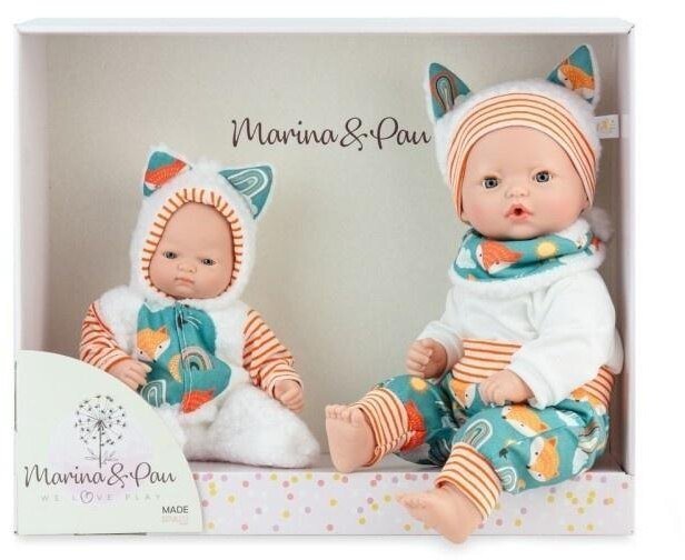 Modnie ubrane dwie lalki hiszpańskie: 40 cm i 26 cm to jedyna w swoim rodzaju propozycja od producenta - Marina &Pau. To wymarzona zabawka dla dzieci, które uwielbiają lalki przytulać, kołysać do snu i przebierać. Wykonane w całości w Hiszpanii lalki posiadają miękki brzuszek oraz głowę i kończyny wykonane z gładkiego, jasnego, ręcznie malowanego winylu. Ubrane są w dopracowane w każdym szczególe ręcznie szyte ubranka o delikatnej kolorystyce.