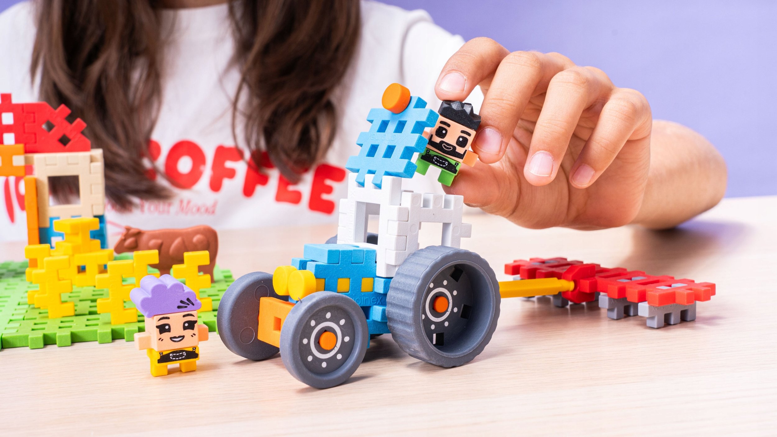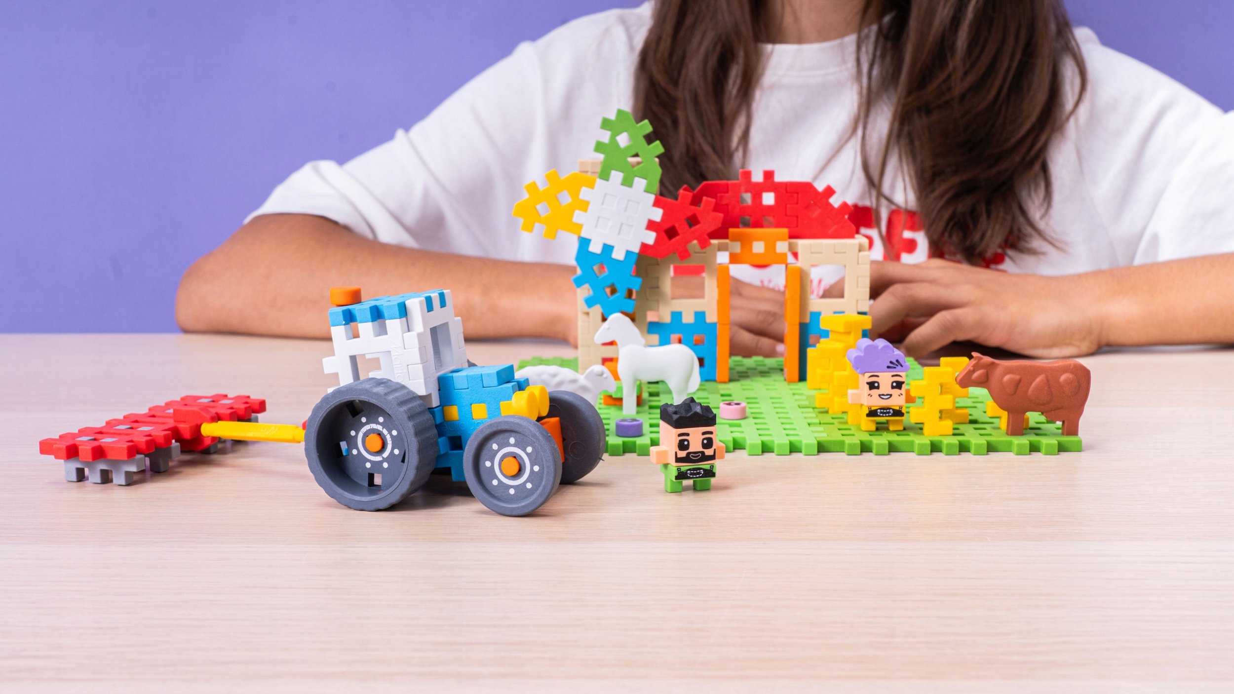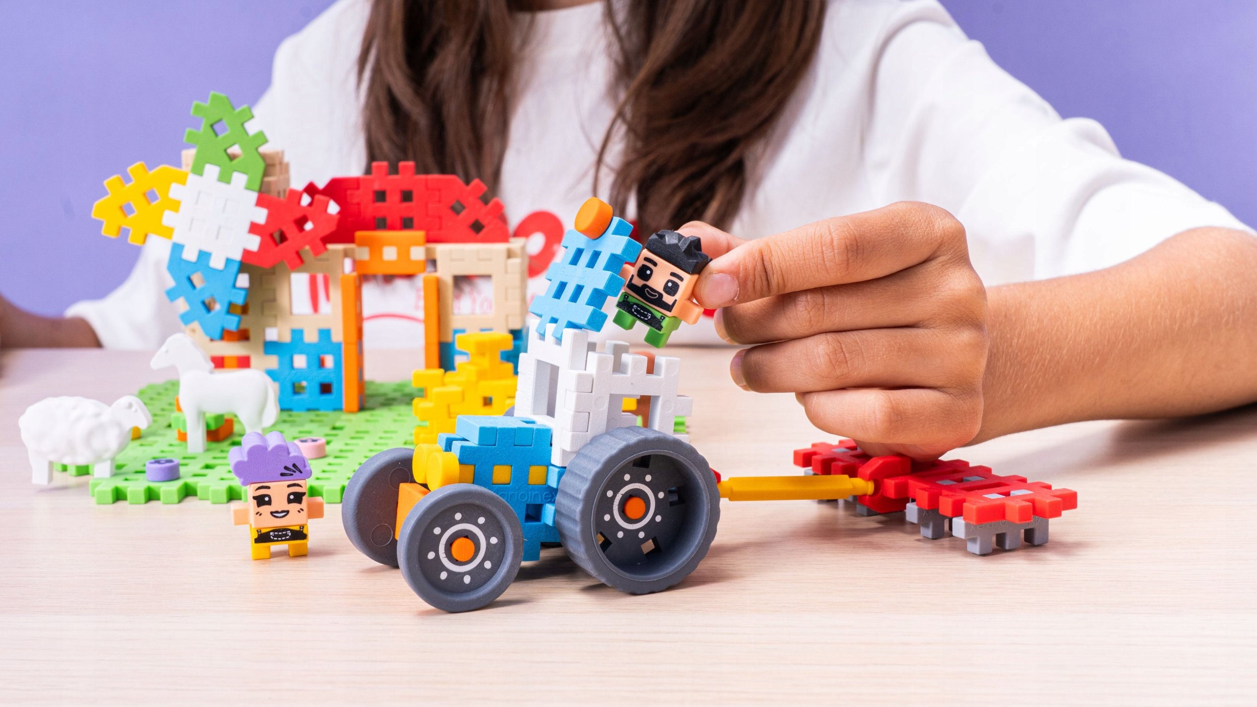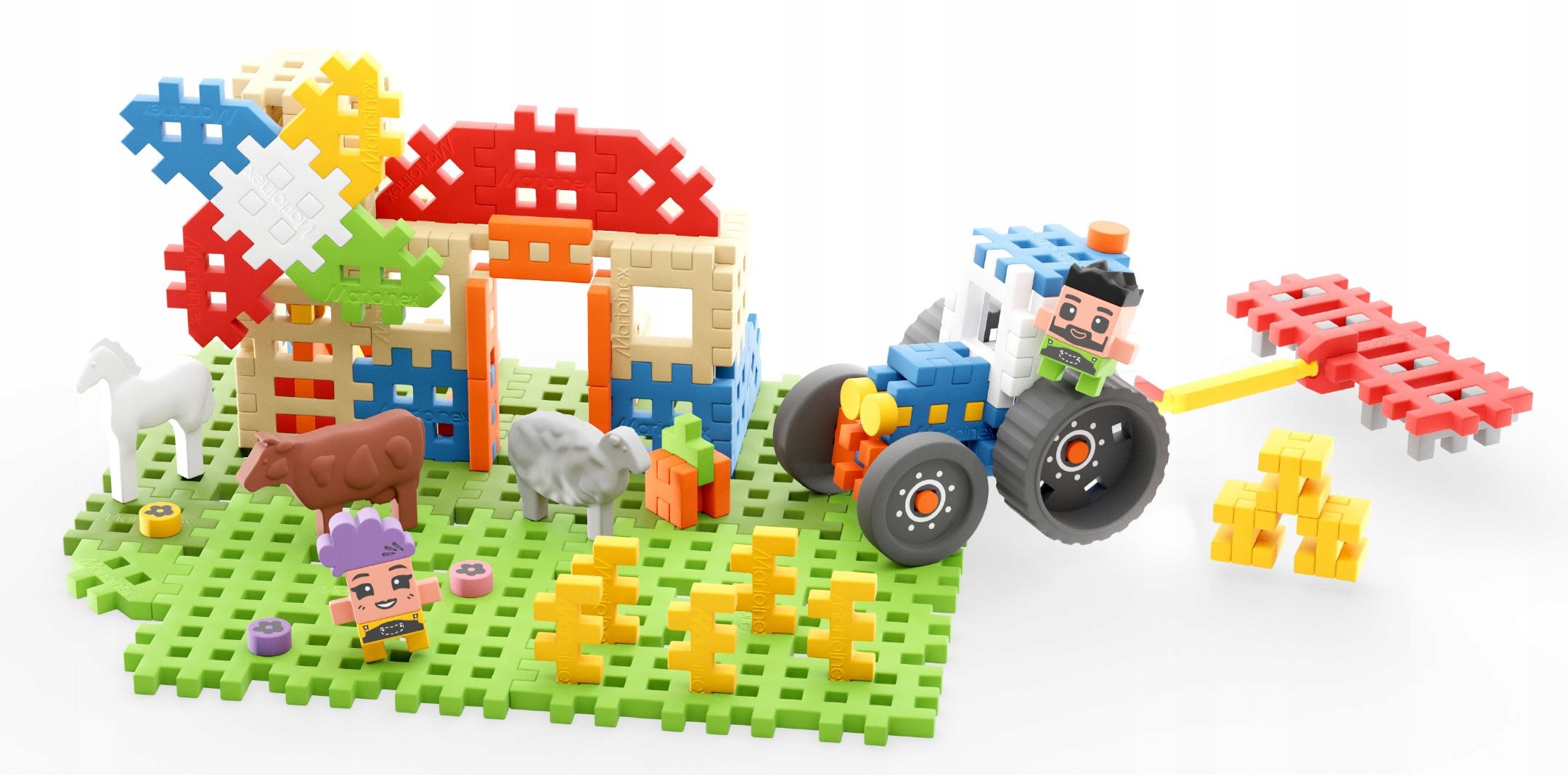 W skład zestawu wchodzą nie tylko klocki, ale również dwie figurki ludzi oraz cztery figurki zwierząt: owca, baranek, krowa i koń. Dzięki temu dzieci mogą nie tylko budować, ale także wymyślać ciekawe scenariusze zabaw z udziałem swoich ulubionych postaci.