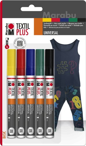 Zestaw markerów Marabu Plus zawiera pięć intensywnych kolorów: żółty, czerwony, ciemnozielony, ciemnoniebieski oraz czarny. Dzięki takiej różnorodności, możesz swobodnie łączyć kolory i tworzyć niepowtarzalne wzory, które ożywią Twoje projekty tekstylne.