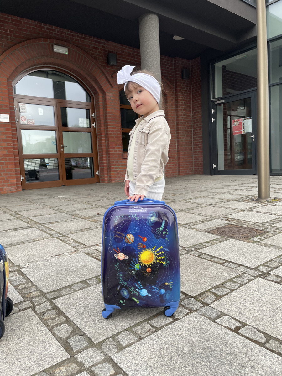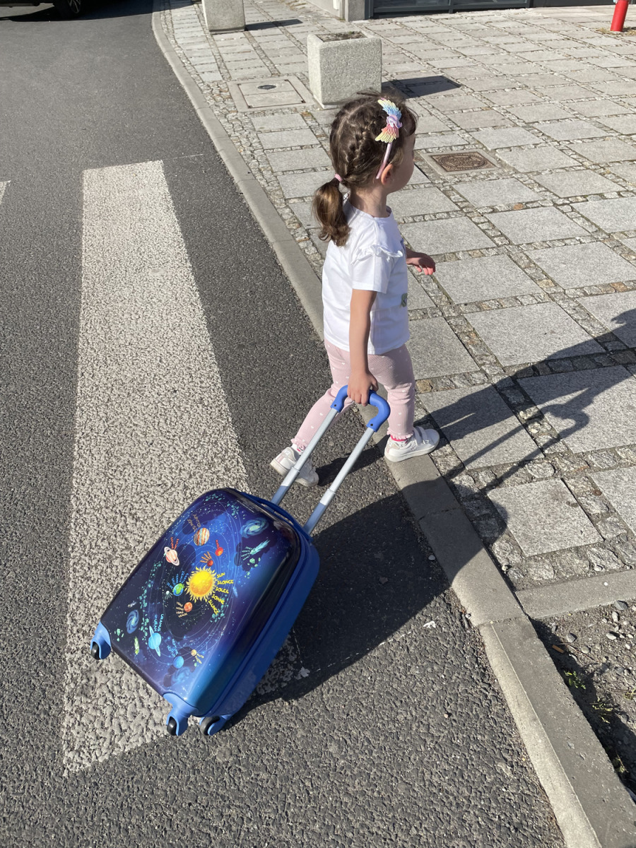 Podróżowanie z tą walizką to czysta przyjemność. Wyposażona jest w cztery obrotowe kółka (360°), które zapewniają płynną jazdę i zwrotność – walizkę można wygodnie prowadzić obok siebie, a nie tylko ciągnąć. Wysuwana rączka z dwustopniową regulacją pozwala idealnie dopasować wysokość uchwytu zarówno do wzrostu dziecka, jak i pomagającego mu rodzica. Wnętrze o pojemności 32 litrów zostało zaprojektowane z myślą o porządku: dwie komory (jedna zamykana na zamek, druga wyposażona w pasy zabezpieczające) ułatwiają segregację ubrań i zabawek, zapobiegając ich przemieszczaniu się w trakcie transportu.