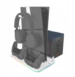 Stojak jest wyposażony w podwójną ładowarkę, która umożliwia jednoczesne ładowanie dwóch kontrolerów PS5. Dodatkowe porty USB pozwalają na wygodne podłączanie i ładowanie wielu urządzeń, co zwiększa komfort korzystania z konsoli.