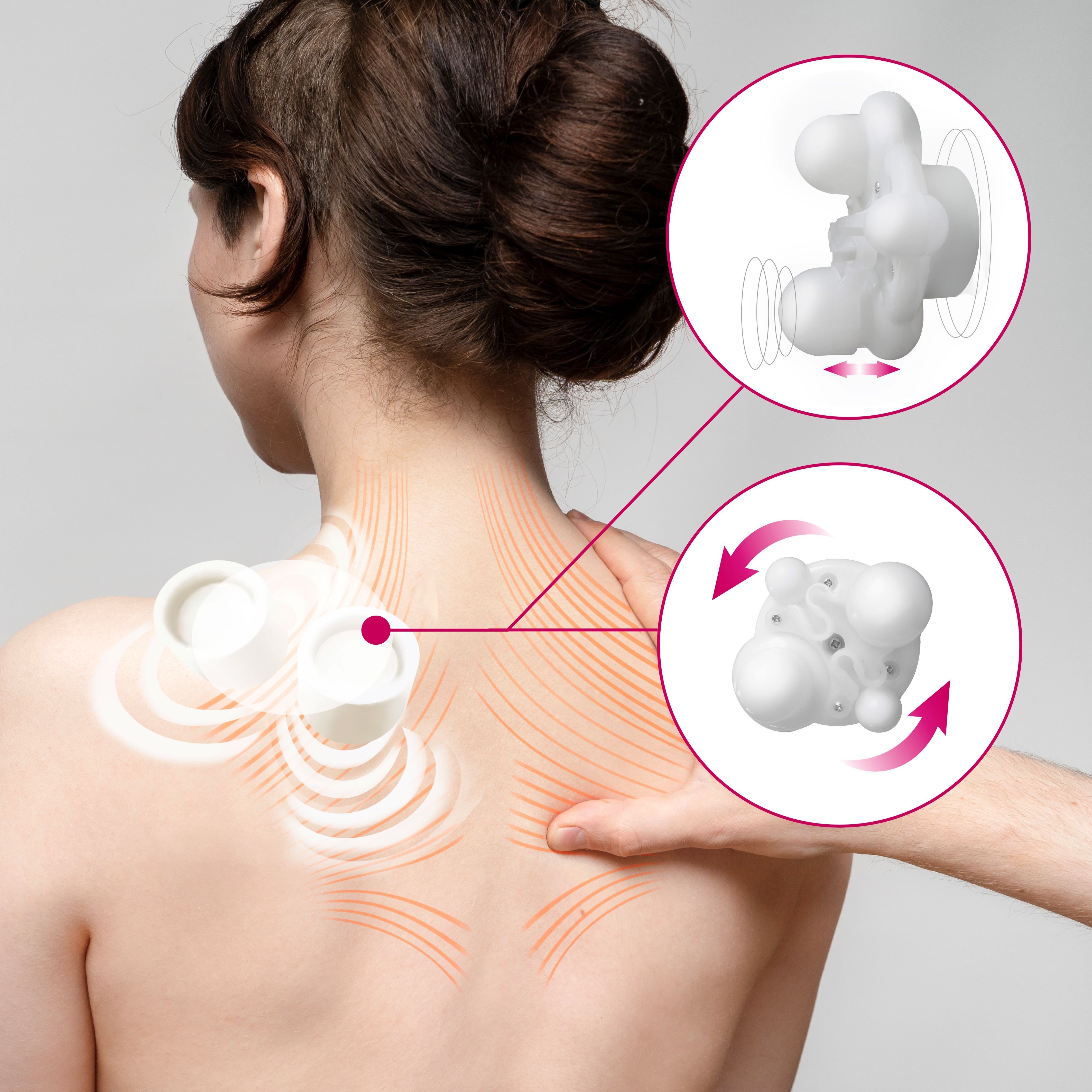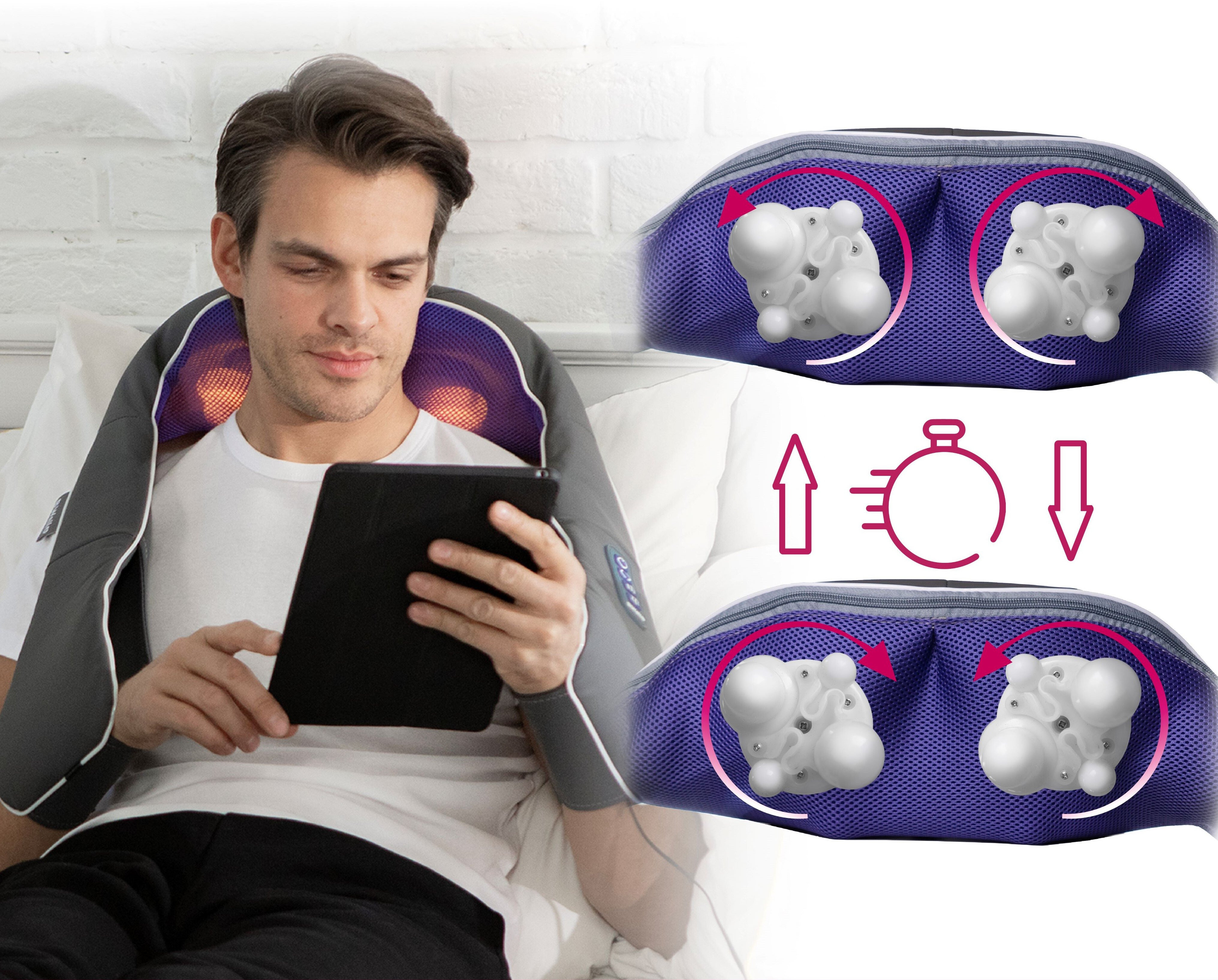 Dwie trójwymiarowe głowice masujące ugniatają, rozcierają i wałkują obolałe miejsca jednocześnie, co skutecznie: