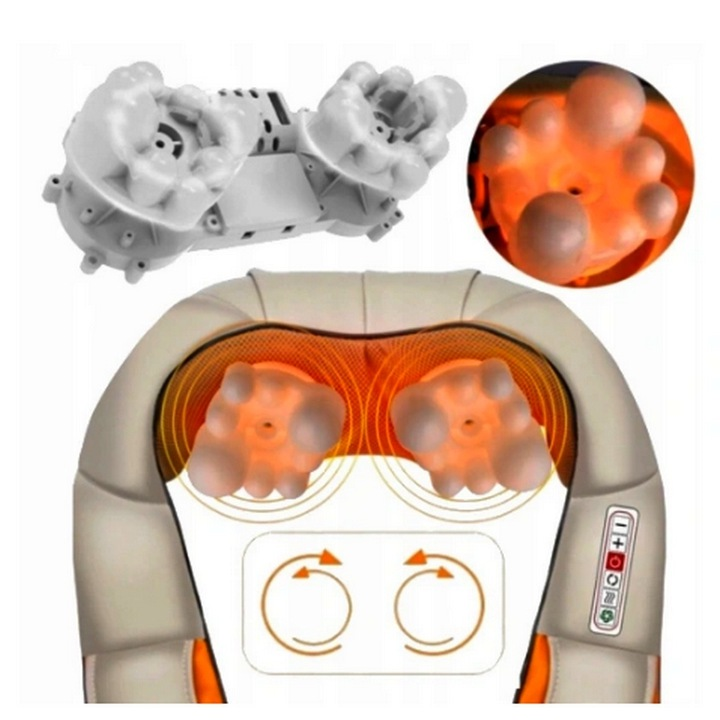 - Rozluźnia spięte mięśnie poprzez masaż 2 obrotowymi głowicami z 16 kulami masującymi (po 8 kul na głowicy) (kule obracają się przeciwbieżnie w prawą i lewą stronę)