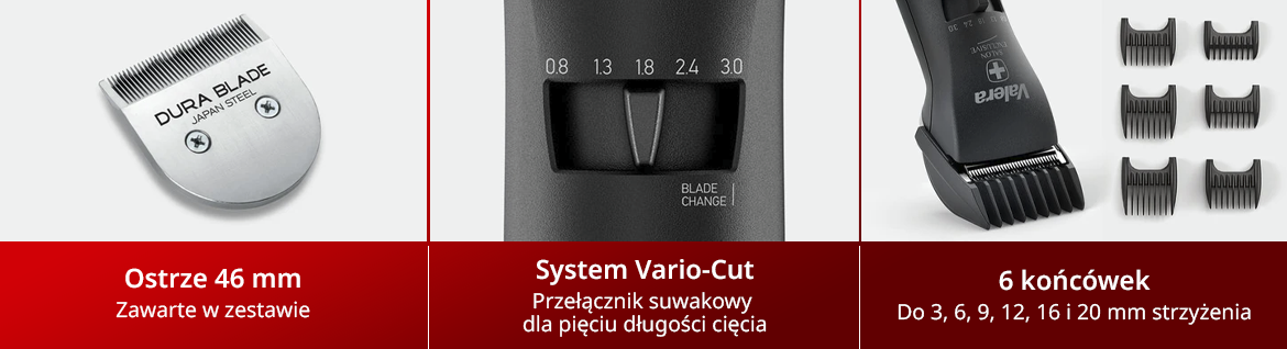 VALERA SWISS Excellence Smart to zaawansowana maszynka do strzyżenia, zaprojektowana z myślą o dokładności strzyżenia. Wyposażona w mocne, szlifowane diamentowo, ostrza z japońskiej stali, o szerokości 46 mm, zapewnia precyzyjne i czyste cięcie. Urządzenie umożliwia dostosowanie długości strzyżenia dzięki pięciu ustawieniom (0,8, 1,3, 1,8, 2,4, 3,0 mm) oraz oferuje sześć nasadek grzebieniowych (3, 6, 9, 12, 16 i 20 mm).