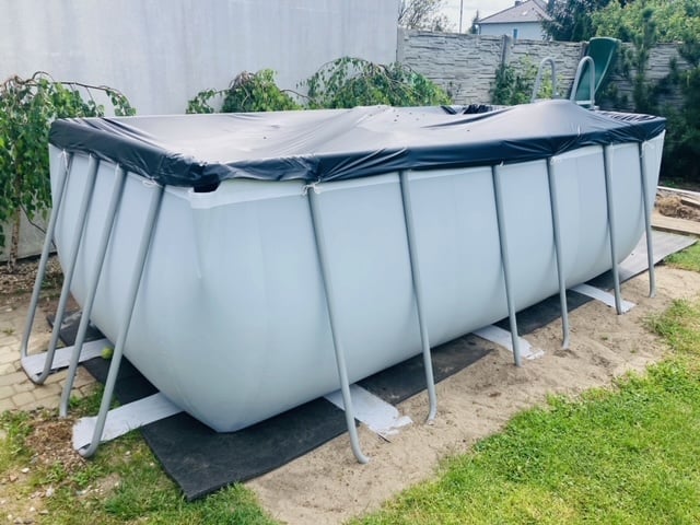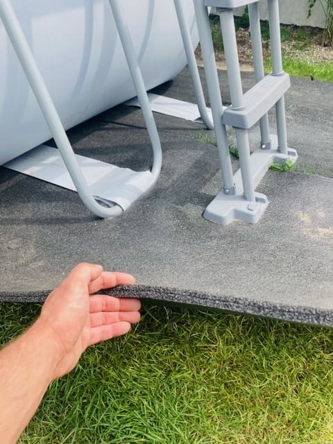 Podkład polietylenowy przychodzi w maksymalnie możliwym kawałku ciętym z rolki o szerokości 1m. Przycinamy fragmenty i układamy obok siebie na przestrzeni, na której będzie stał basen, a następnie łączymy ze sobą metrowe pasy podkładu szarą taśmą zbrojoną (tak zwaną srebrną taśmą). Na to już można rozłożyć konstrukcję basenu.