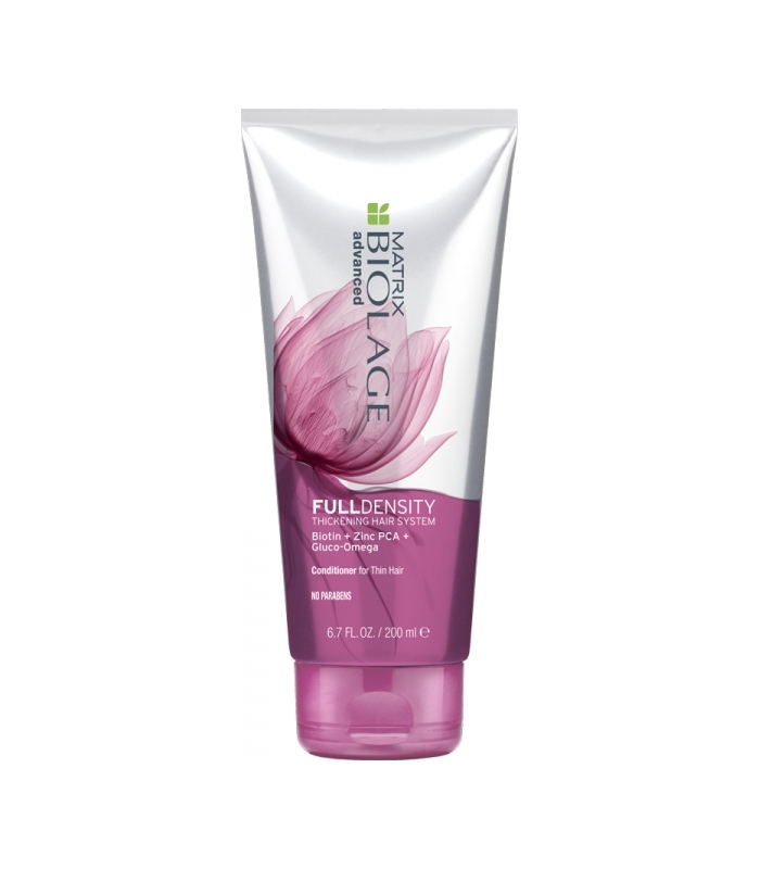 MATRIX Biolage Fulldensity to odżywka pogrubiająca, przeznaczona do pielęgnacji włosów cienkich. Zawiera biotynę, która ma działanie wzmacniające macierz włosa poprzez utrzymywanie spójności wiązań siarkowych znajdujących się w jego łodydze. Biotyna działa korzystnie także na skórę wokół włosa pozwalając mu na szybszy wzrost. Cynk PCA ma pozytywny wpływ na pracę gruczołów łojowych oraz metabolizm aminokwasów, co pozwala na sprawne wiązanie keratyny we włosach. Dodatkowo kompleks Gluco-Omega Blend pozwala uzyskać pełną objętość i strukturę włosów poprzez zwiększenie ich gęstości. Odżywia i regeneruje łuski włosa, nadaje wyraźnie większą obkętość oraz lśniący blask.