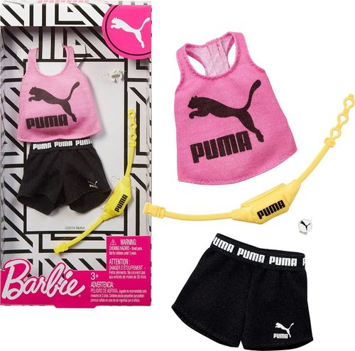 W zestawie znajdziemy niezwykle modny sportowy zestaw dla lalki Barbie. Różowa koszulka na ramiączkach i czarne krótkie spodenki spodobają się wszystkim miłośniczkom miejskiego stylu. Dopełnieniem całości są biały zegarek i żółta torebka "nerka". Każdy element stylizacji sygnowany jest logiem Puma.