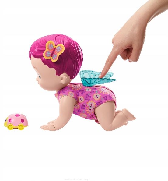 Ta lalka My Garden Baby (ok. 30 cm) uwielbia chichotać i raczkować! Dotknij jej skrzydełek, aby zaczęła się ruszać i wydawać 20 dziecięcych odgłosów czekają Cię całe godziny interaktywnej zabawy. Lalka uroczo chichocze i gaworzy, a podczas raczkowania porusza skrzydełkami! W zestawie jest też biedronka na kółkach, aby lalka My Garden Baby mogła z nią podążać. Urocze skrzydełka, motylkowa ozdoba na głowie i słodki zapach jaśminu sprawiają, że zajmowanie się tym maluszkiem to sama przyjemność. Przenieś się w świat zabawy z Raczkującym Bobaskiem-Motylkiem! Kolory i elementy dekoracyjne mogą się różnić.