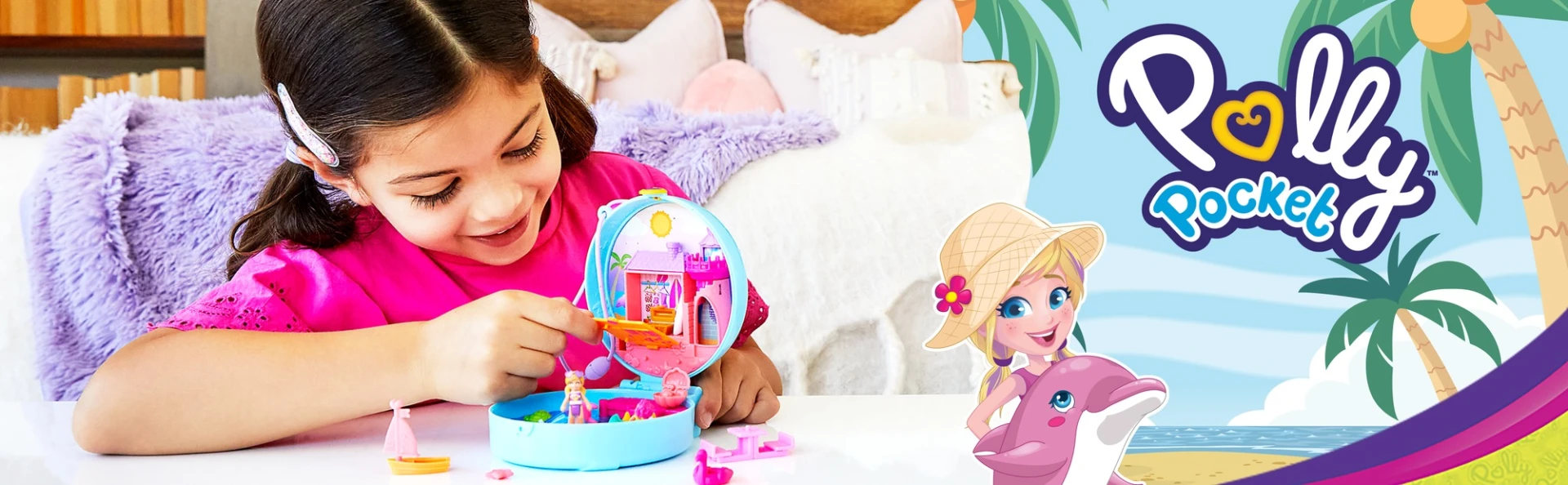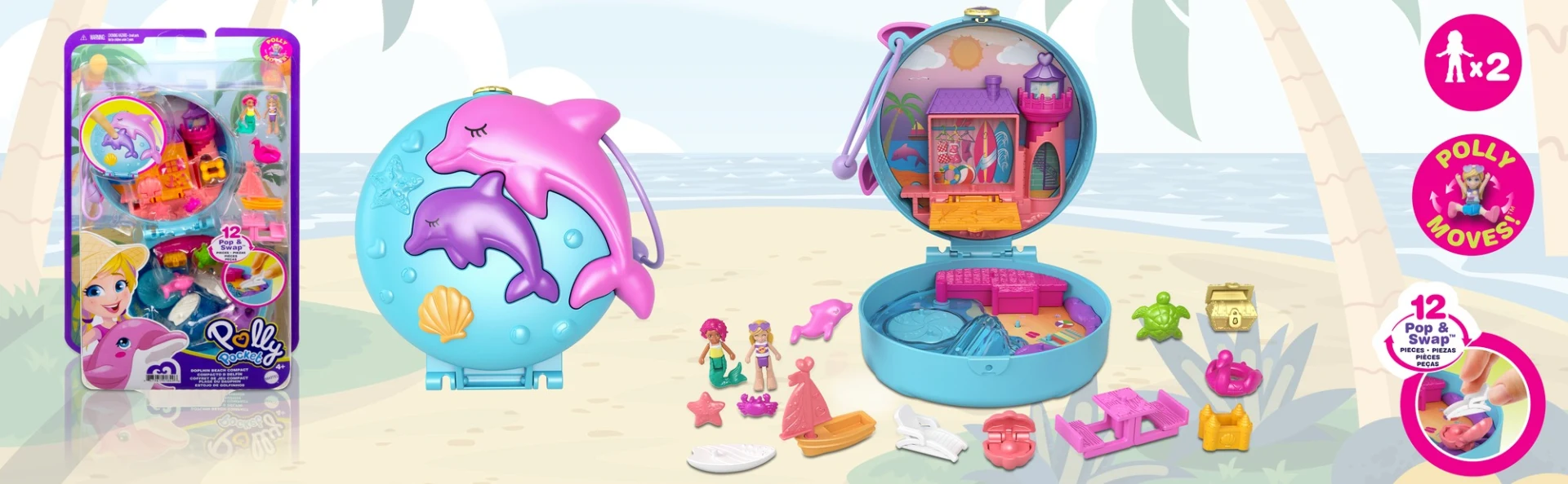 Przygotuj się na wodnistą zabawę w oceanie z Polly Pocket™! Idealny do zabawy w domu lub w podróży, ten zestaw kompaktowy Dolphin Beach ma dwa urocze delfiny na zewnątrz (mniejszy delfin jest wykonany z powolnej, gąbczastej pianki) i otwiera się, ukazując ekscytującą przygodę o tematyce plażowej! Kompakt zawiera również mikro Polly™ i lalkę syrena (każda z ruchomymi przegubami), 5 zabawnych odsłon i 12 akcesoriów! Odkryj i rozegraj zabawę z opowiadaniem historii, otwierając drzwi do domku na plaży, zbadaj latarnię morską, otwórz skrzynię skarbów, aby dowiedzieć się, co jest w środku, zakręć wodnym wirem, porusz falę i otwórz muszlę! Niektóre z akcesoriów mają funkcję kołków Pop & Swap™, dzięki czemu dzieci mogą podłączyć je do różnych obszarów kompaktu, aby uzyskać nieskończone możliwości zabawy!