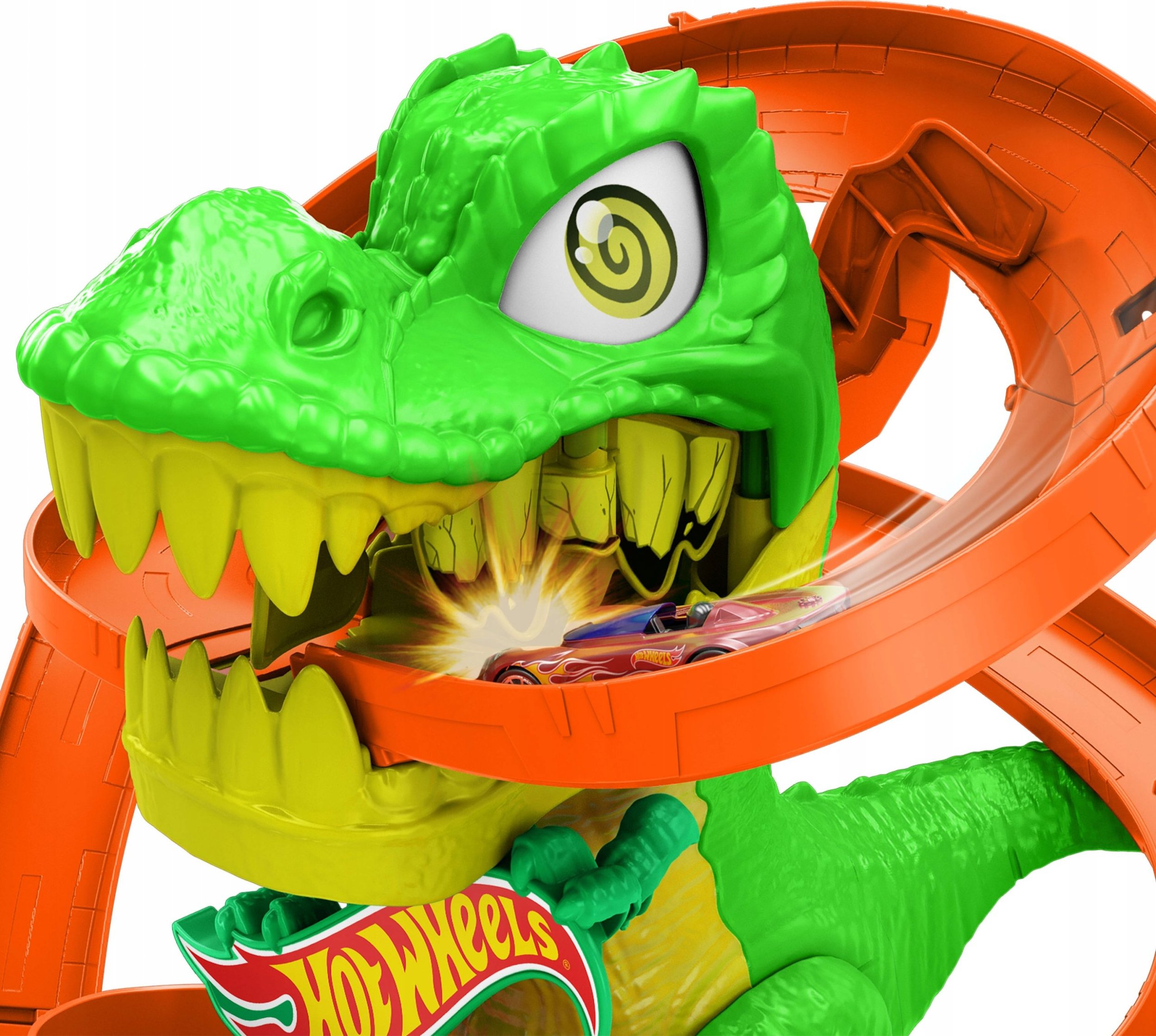 Przygotuj się na pełną adrenaliny akcję w sercu Hot Wheels City! Potężny T-Rex zaatakował miasto i próbuje pożreć wszystkie samochody. Tylko od Twoich rajdowych umiejętności zależy, czy uda się go powstrzymać. Zestaw „Remiza T-Rexa” to ekscytujący tor, który wciągnie każdego małego fana motoryzacji w wir bohaterskiej zabawy i kreatywnego opowiadania historii.
