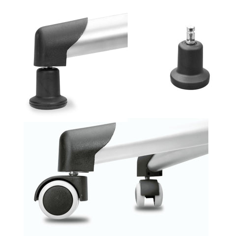 Krzesło w wersji standardowej posiada kółka, odpowiednie zarówno do dywanu jak i twardej podłogi.