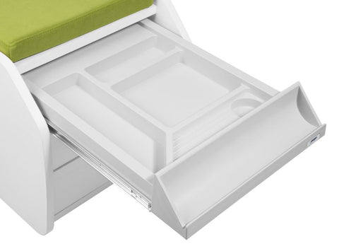 Górna szuflada to organizer z 6 przegródkami, który pomieści wszystkie niezbędne przybory np. ołówki, długopisy itp.