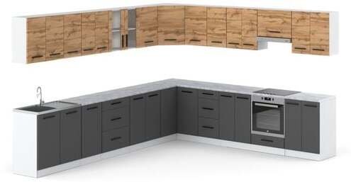 Meble Kuchenne Szare Z Drewnem Narożne Kuchnia Rossa 6.8m Dąb Wotan Szara