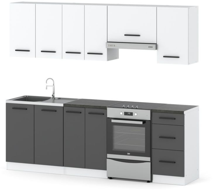 Zestaw mebli kuchennych Mokka o długości 2.4m to doskonałe rozwiązanie dla tych, którzy pragną nowoczesnych i funkcjonalnych elementów do swojej kuchni. Połączenie białego i szarego matowego wykończenia sprawia, że zestaw idealnie wkomponuje się w różnorodne aranżacje wnętrz, zarówno te nowoczesne, jak i klasyczne.