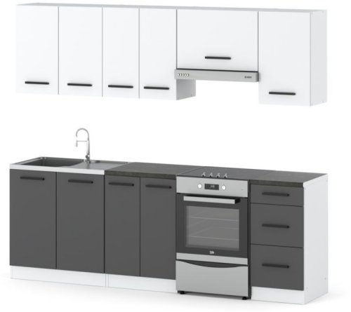 Zestaw składa się z 10 drzwiczek, 10 półek oraz 3 szuflad, co zapewnia mnóstwo miejsca do przechowywania naczyń i akcesoriów kuchennych. Wygodne prowadnice rolkowe z blokadą wysuwu gwarantują płynne i bezpieczne użytkowanie szuflad, co jest niezwykle istotne w codziennym użytkowaniu kuchni.