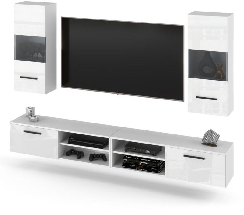 Ten zestaw mebli oferuje wyjątkową przestronność, dzięki 6 półkom oraz 4 zamykanym szafkom, które umożliwiają wygodne przechowywanie rzeczy codziennego użytku. Dzięki temu, możesz łatwo zorganizować swoje wnętrze, a jednocześnie wyeksponować ulubione dekoracje i sprzęt multimedialny.