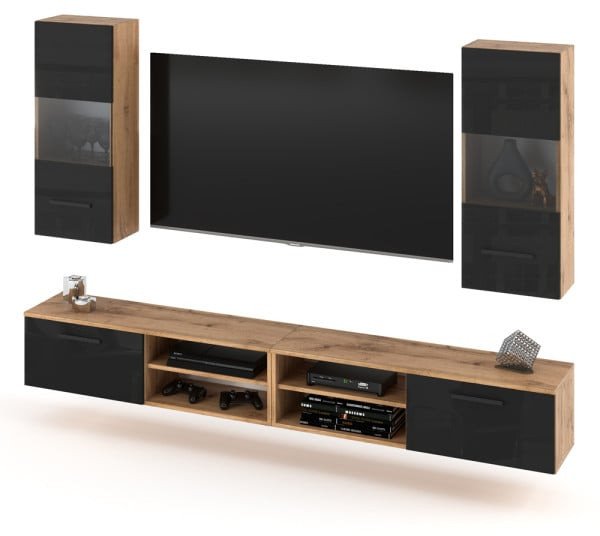 Meblościanka BANDLE to nowoczesny zestaw mebli wiszących, który idealnie odnajdzie się w każdym salonie. Jej przemyślana konstrukcja łączy estetykę z funkcjonalnością, oferując zarówno przestrzeń do przechowywania, jak i miejsce na wyeksponowanie dekoracji. Dzięki eleganckiemu czarnemu połyskowi, meblościanka wprowadza do wnętrza nowoczesny akcent, doskonale wpisując się w aktualne trendy aranżacyjne.