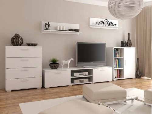 Meblościanka Szopen 2 składa się z pojemnej komody, szafki RTV, szafki stojącej oraz dwóch półek wiszących, co zapewnia wystarczającą przestrzeń do przechowywania oraz eksponowania dekoracji. Dzięki temu zestawowi zyskujesz nie tylko miejsce na sprzęt RTV, ale także przestrzeń na przechowywanie różnych przedmiotów oraz dekoracji, co pozwala na stworzenie przytulnej atmosfery w Twoim salonie.