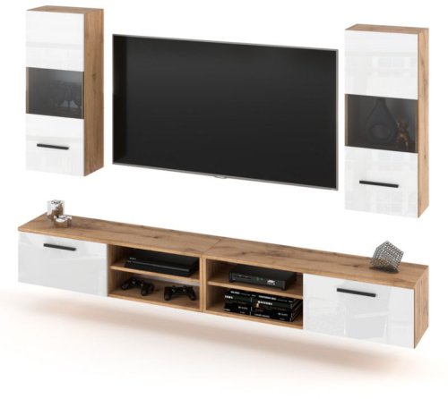 Meblościanka Wisząca Do Salonu 240cm Pojemna Szafka Rtv Wotan Biała Połysk